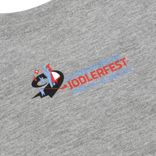 Ce t-shirt à manches courtes dédié à la Fête fédérale de yodel séduit par son design graphique moderne et épuré. Sur le devant, un imprimé compact représentant des éléments traditionnels stylisés apporte une touche subtile. Au dos, un petit imprimé minimaliste avec l'inscription « JODLERFEST » reprend discrètement le motif. Le tissu gris clair chiné et la coupe classique à col rond garantissent un confort agréable et un look intemporel, idéal pour les festivaliers qui souhaitent afficher leur attachement à la tradition suisse avec simplicité et élégance.